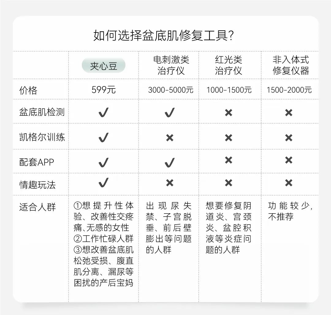 在推荐给大家之前,我也把夹心豆和市面上流行的盆底肌修复仪器做了对比,发现它的性价比还是很高的: