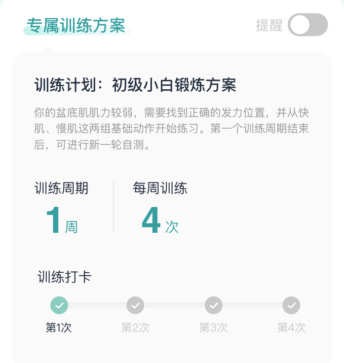 报告生成后,还会为你量身定制一份盆底肌训练计划。我的盆底肌属于偏弱,APP就提示我,“从报告来看,你的盆底肌肌力较弱,建议做基础提升训练。训练内容:快肌3组,慢肌3组。跟随语音开始……”