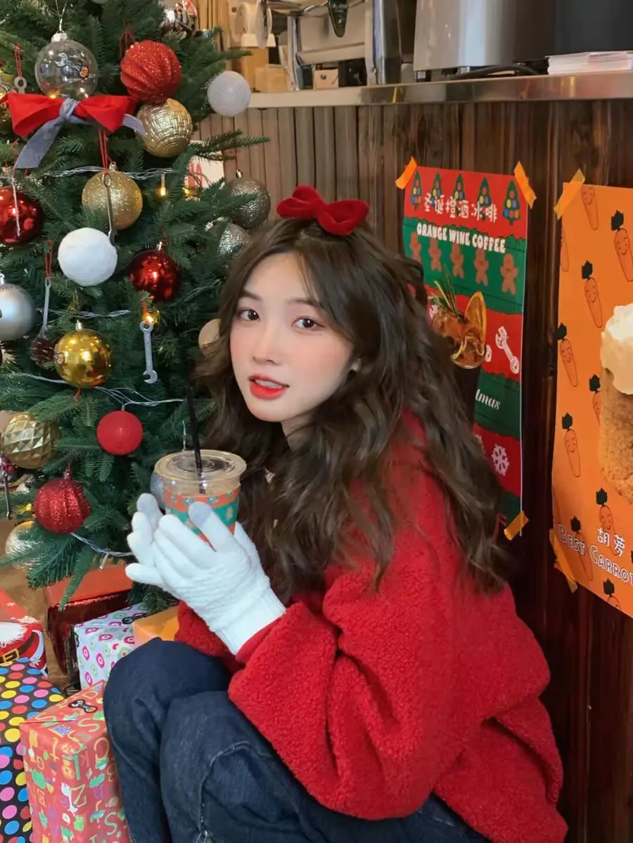 1️⃣️p1-2 蹲下来靠在圣诞树🎄旁边 让你的小姐妹👭拿着手机📱用前置自拍的角度 看着镜头摆姿势(假装托下巴、双手放下巴下露牙笑、比耶️✌)