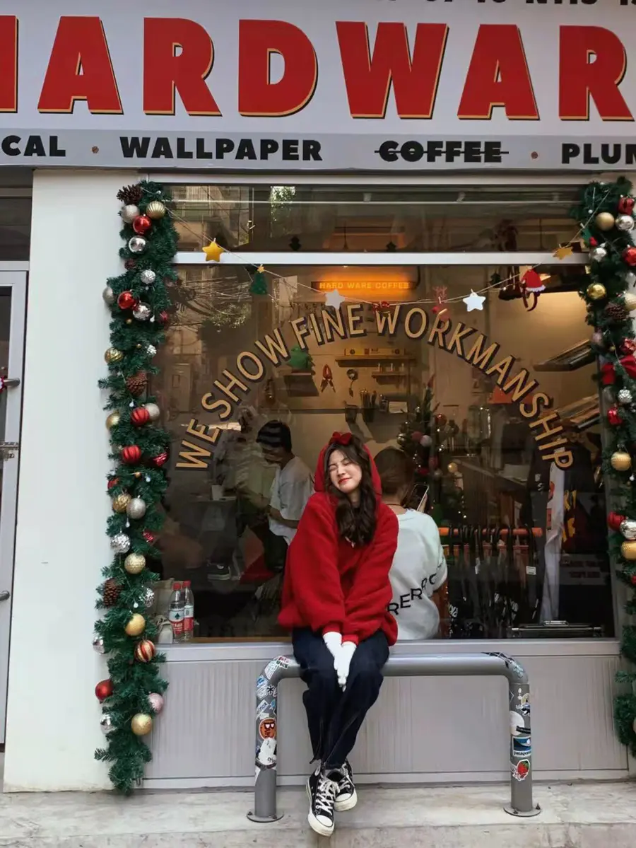 4️⃣️p6-8 在门口有圣诞装饰的玻璃窗也拍一张🌷坐在杆子上 戴上帽子 手拿着帽子 腿伸直(显腿长)🙊腿收回来 手放在腿上 眯着眼睛笑来一张🎈单脚抬起来 双手张开(假装在起飞🛫️)看向别的地方 咔嚓📷来一张 让你的小姐妹站在远处拍全身~
