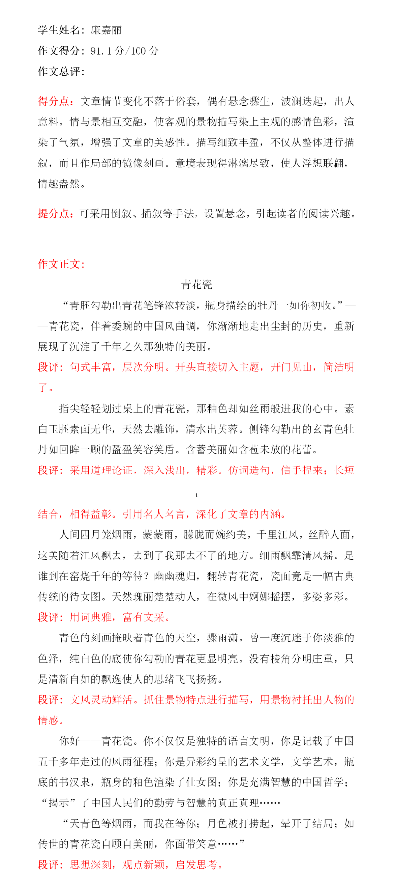 廉嘉丽同学纯真朴实,待人诚恳友善。活泼乐观,是同学们的“开心果"。她勤奋努力,乐于动笔,写作中时有灵感闪现。希望她在文学的天地里,尽情抒写自己的人生,畅想未来,放飞梦想!