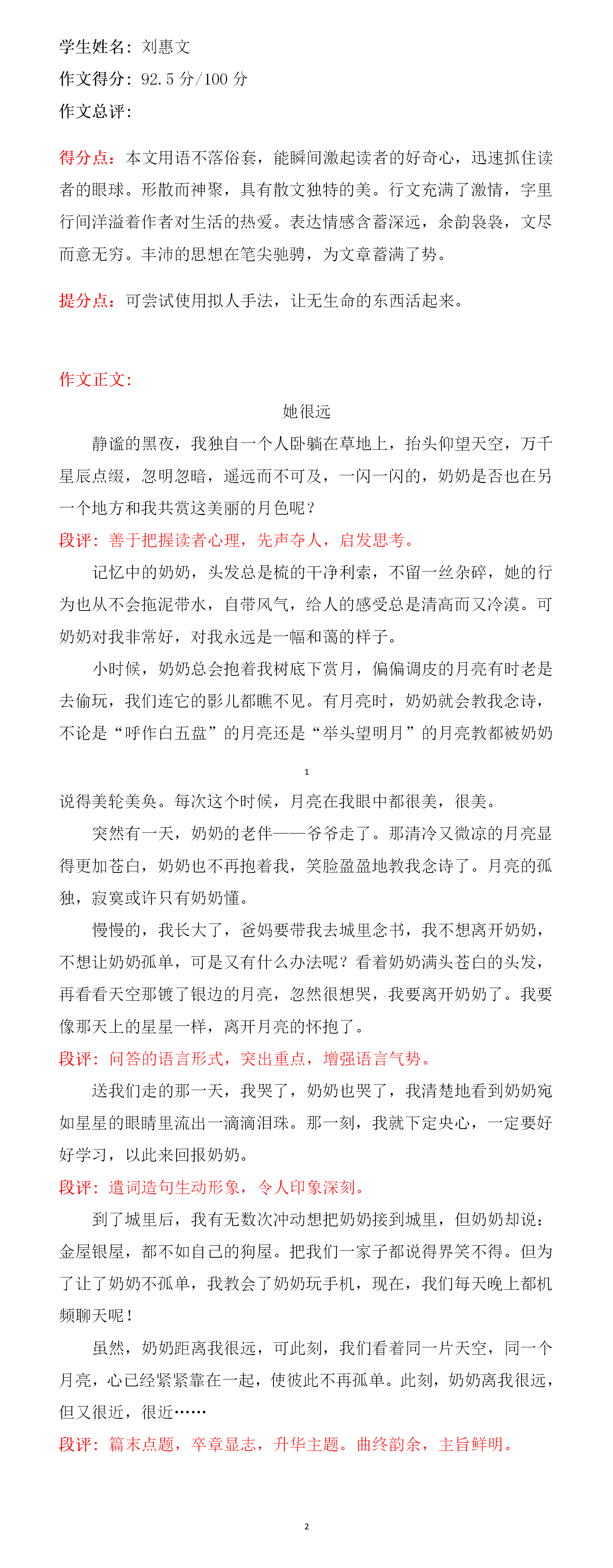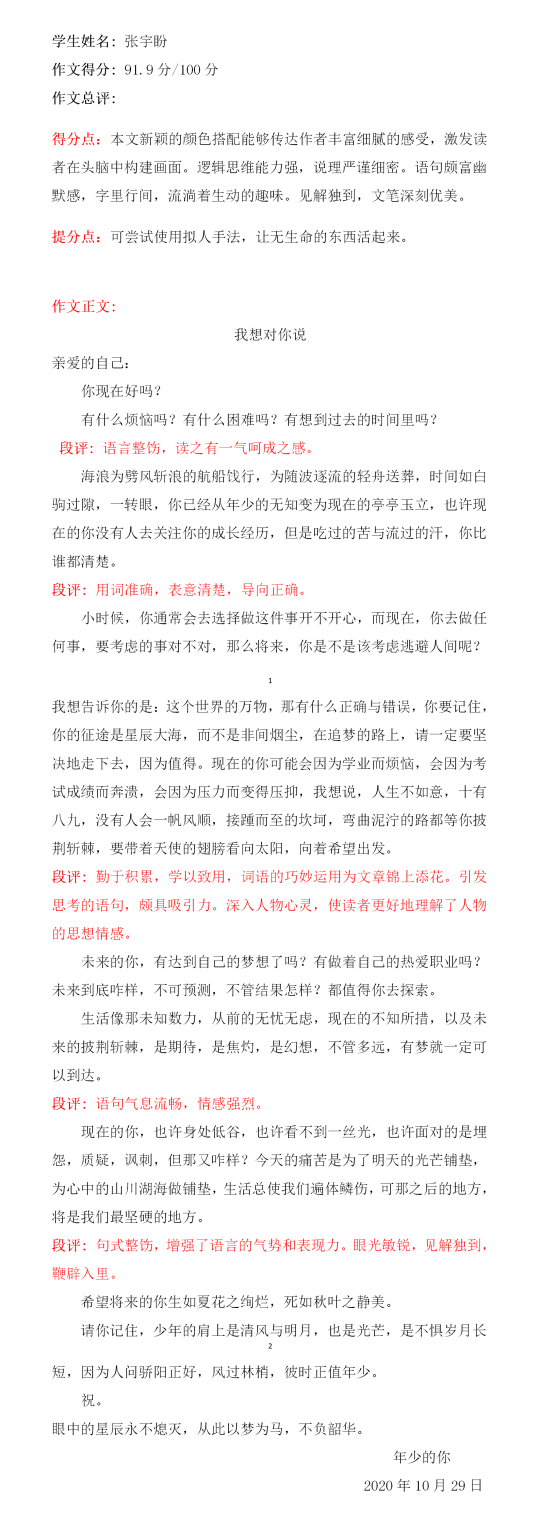 张宇盼是一个让人一想到她就不经意微笑的女孩儿,小小的宇宙,大大的期盼。学习认真落实,写作反复琢磨,善用设悬,修辞充分突出自己在写作中的优势,继续努力,愿你在文学的道路上再创佳绩!