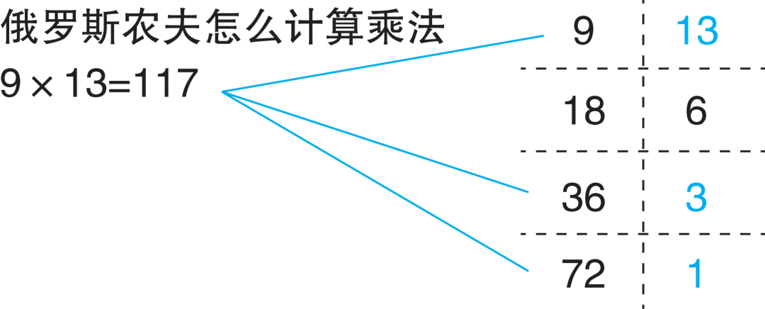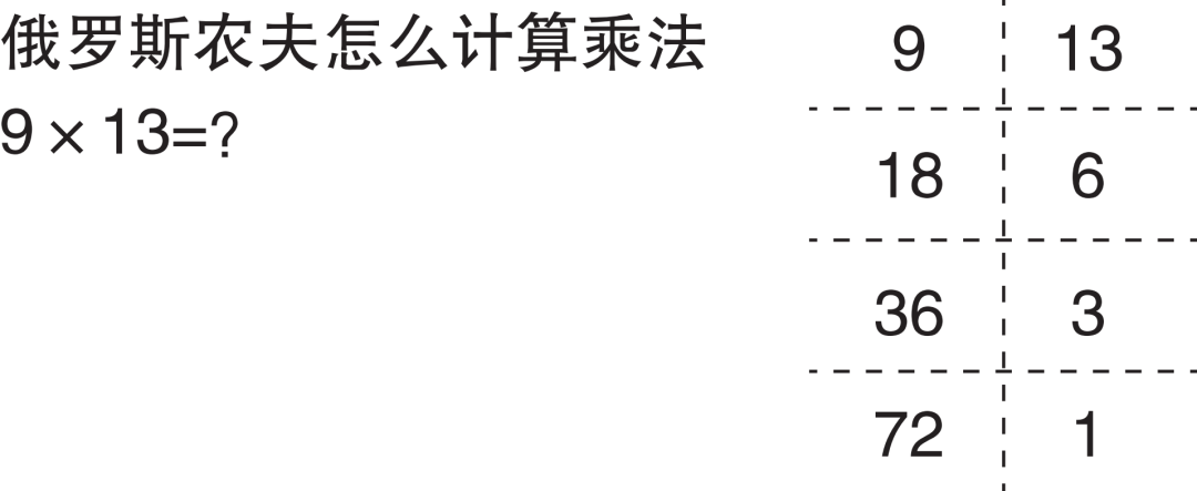 俄罗斯人会拿一张纸,把9和13,分别写在第一行的左边,和右边。然后,在第二行,把9翻倍(18),把13减半(6.5)。6.5不是整数,就舍掉小数,只写6。所以第二行就是18和6。同理,第三行把18翻倍,把6减半,就得到36和3。第四行,再翻倍和减半,就得到72,和1.5。1.5扔掉小数,当1用。于是第四行,就是72和1。