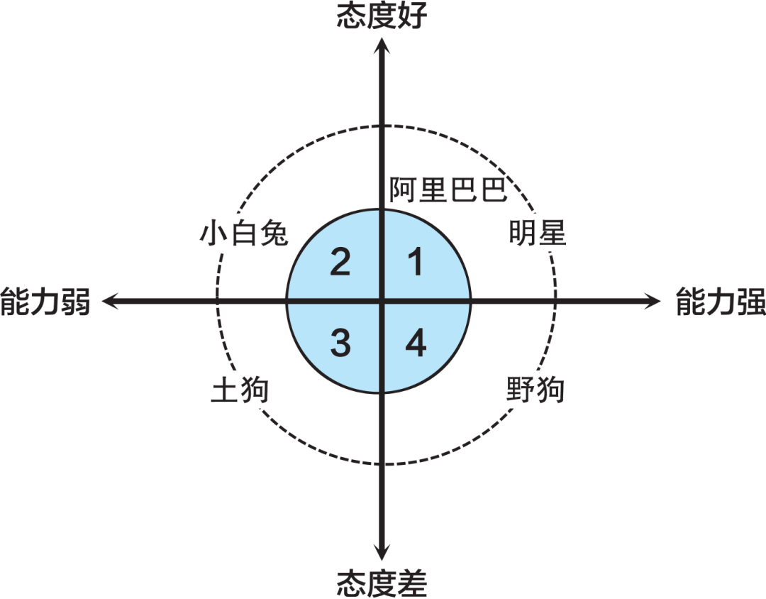 明星,小白兔,土狗,野狗。这就是阿里把员工分类的方法,是个典型的二维视角。