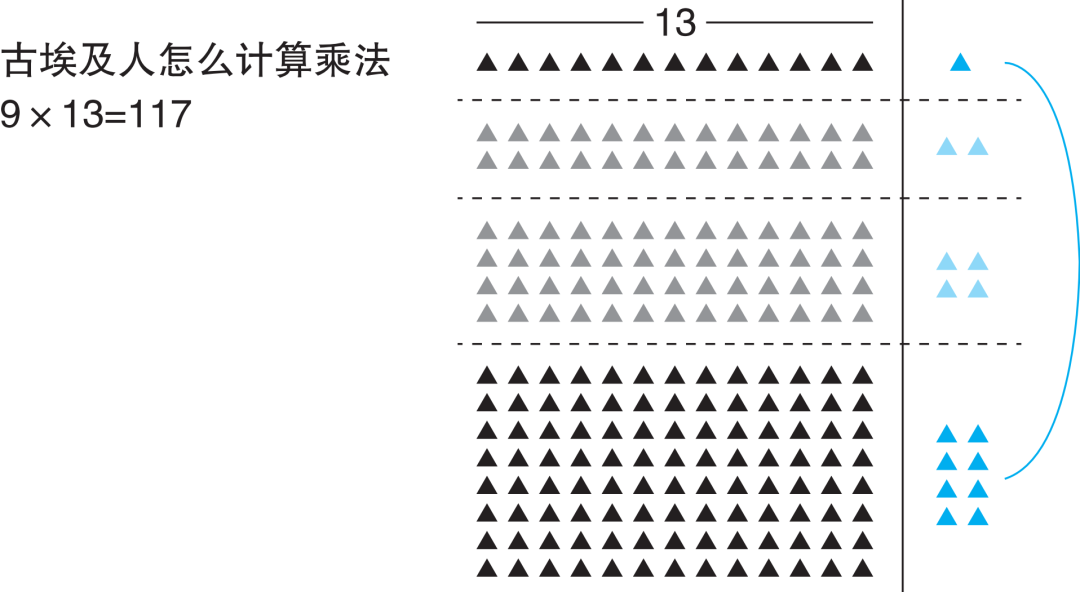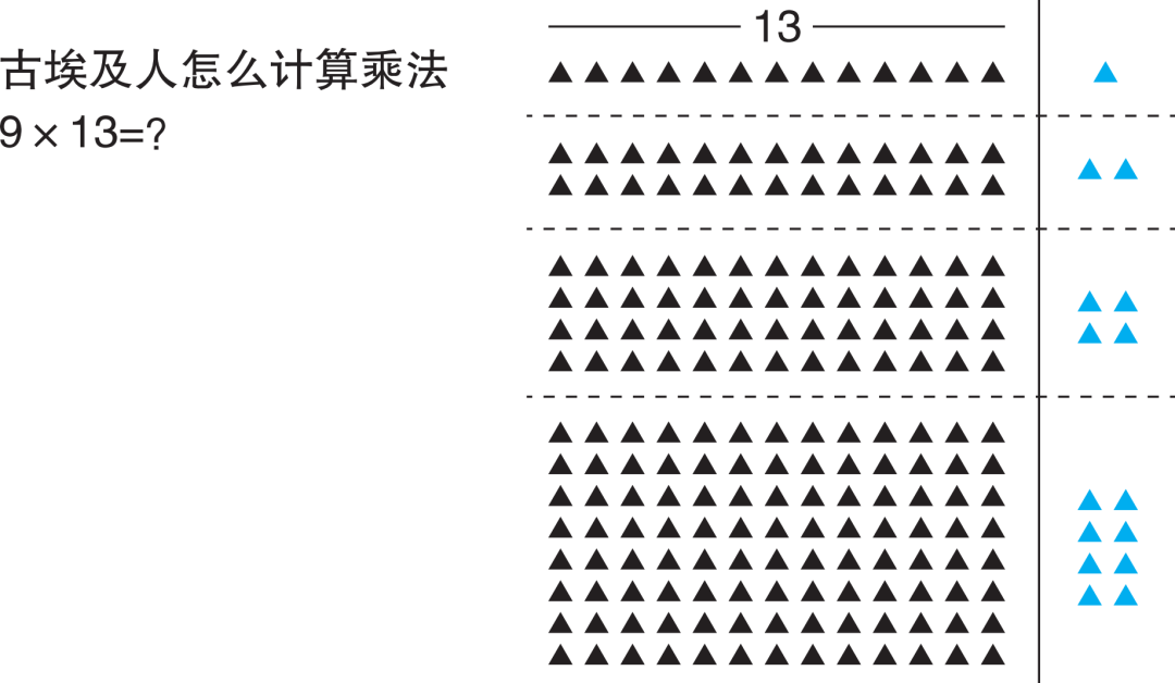 再比如古埃及。古埃及人的乘法,很有意思。9乘以13,怎么算?