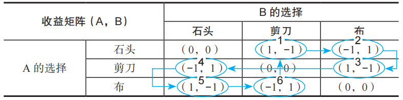 但是如果A预判了B的预判,知道B预判自己出石头,所以出布,于是就出了剪刀(有点拗口啊),情况就再次逆转,收益变为(1,-1),A加1分,B减1分。