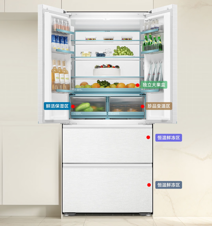 ✅法式多门:容量利用率高,上方是大冷藏室,下方冷冻区超宽大抽屉可以放大体积食材,如整鸡整鱼、羊腿、大份冷链食品之类的,但整体分区少,东西混在一起容易乱。