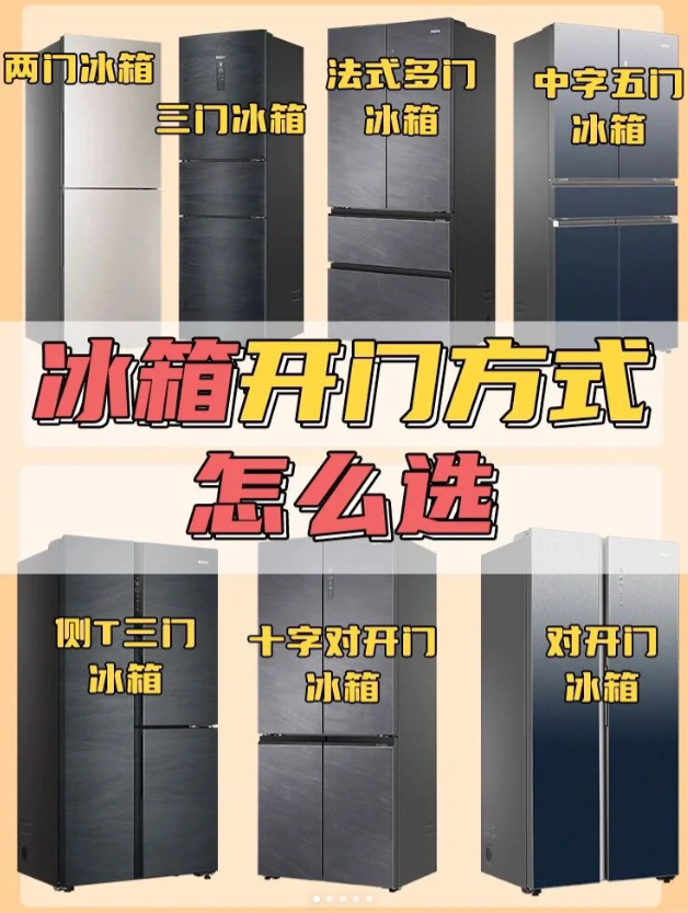 主流冰箱门款式主要包括两门/三开门、对开门、十字门、法式多门、日式多门、侧T门、中字门等,每种款式在空间利用、节能效果和适用场景上各有特点。