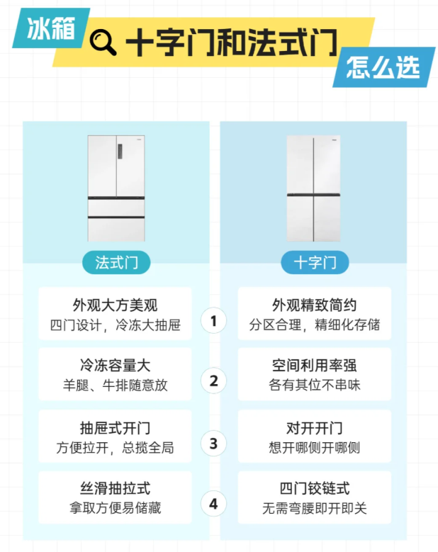 🛒冰箱款式选择建议:目前最主流的款式还是以十字门、法式门,对分区精细储存有要求可选十字门,对大件食材存放有要求可选法式门