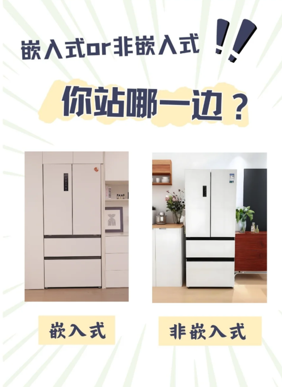 🛒嵌入和非嵌入式选择建议:追求厨房的高颜值和一体化设计,选嵌入式冰箱;更注重性价比和安装灵活性,没有嵌入需求,选择非嵌入式冰箱
