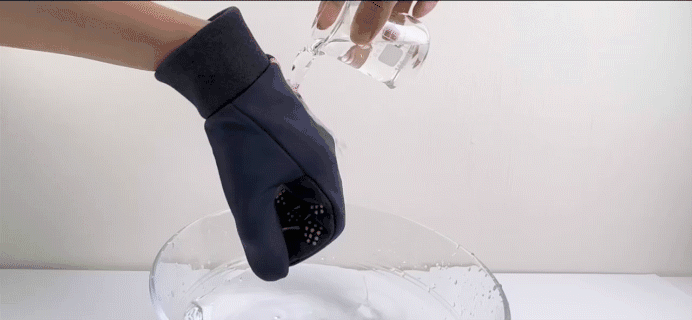 我们直接拿杯水往手套上泼,水流只会沿着手套表面滑下去,不会渗入手套内部。你们看,手套内部还是干的。