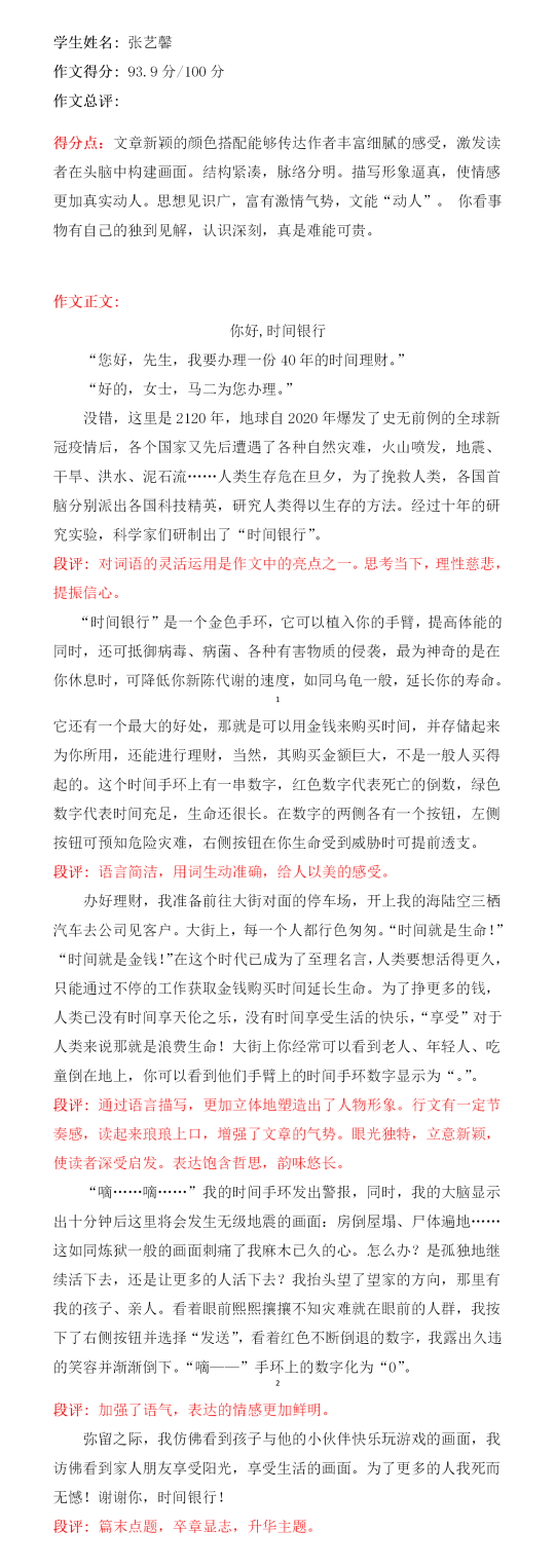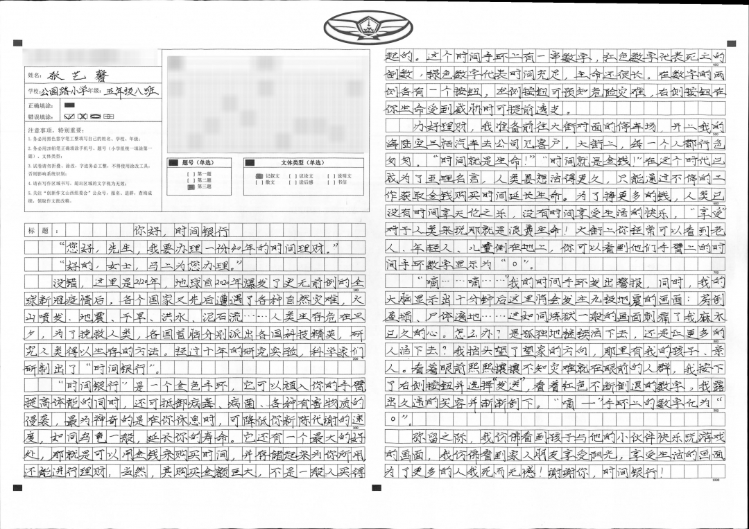 老师讲过想像作文要以现实生活为基础,不光要有扣人心弦的故事情节,更要有催人上进的力量。因为每一个科幻故事,除了启发我们的想像力之外,同时还歌颂了正义战胜邪恶、赞美了正义的事和正直的人。我发现,生活节奏紧张的现代生活,每个人都在为生活而忙碌奔波,与家人相聚的时间越来越少,所以我想借“你好,未来的时间银行”这篇文章,希望每一个孩子的爸爸妈妈都能多抽时间陪伴自己的家人。