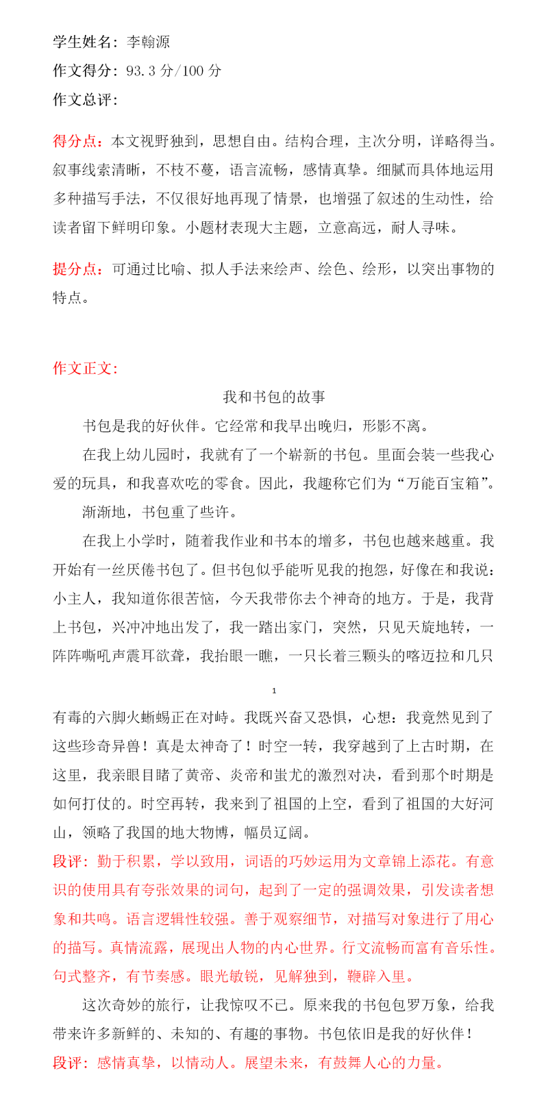 小作者有丰富的想象力,文章构思新颖,思路清晰,语句通顺,故事情节生动有趣,讲述了书包带给“我”的奇妙旅行,引起读者的阅读兴趣。