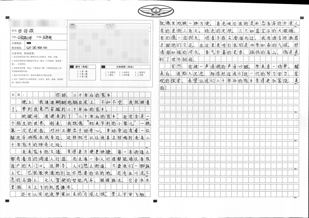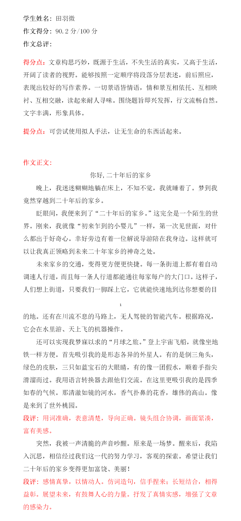 田羽微同学一直以来勤奋刻苦,学习态度认真,是同学们学习的好榜样。她平时一有时间就畅游在各种书籍中,主动进行积累和摘抄,为自己的表达和习作奠定了坚实的基础。加之她性格比较安静,又比别的同学多了一些观察和思考的时间。在这次的习作中,她就把自己在生活中的观察所得加以充分的想象,对未来的家乡进行了美好的憧憬,行文中思路清晰,语言流畅,让人随着她的描述也对未来的家乡心驰神往起来。“问渠哪得清如许,为有源头活水来。”相信她在以后的成长中会凭借着自己的优点,不断努力,创作出更多优秀的作品。