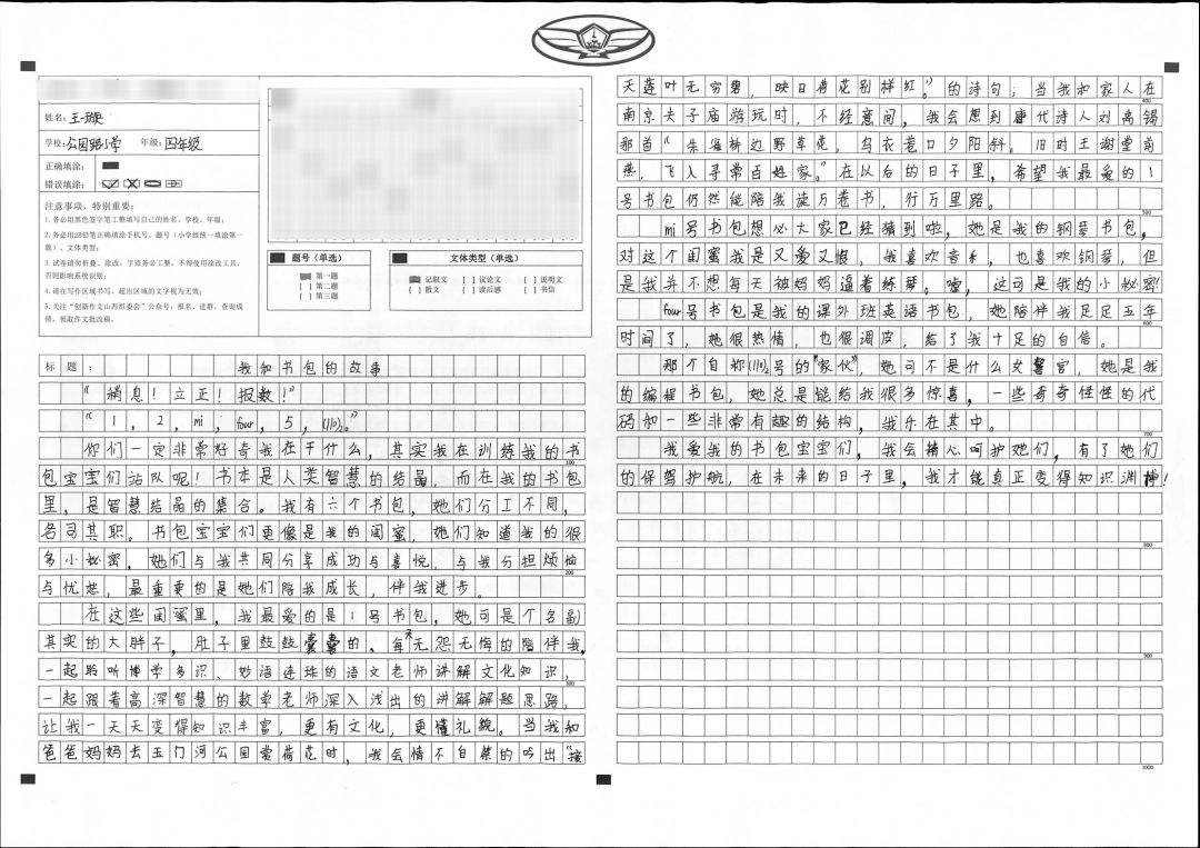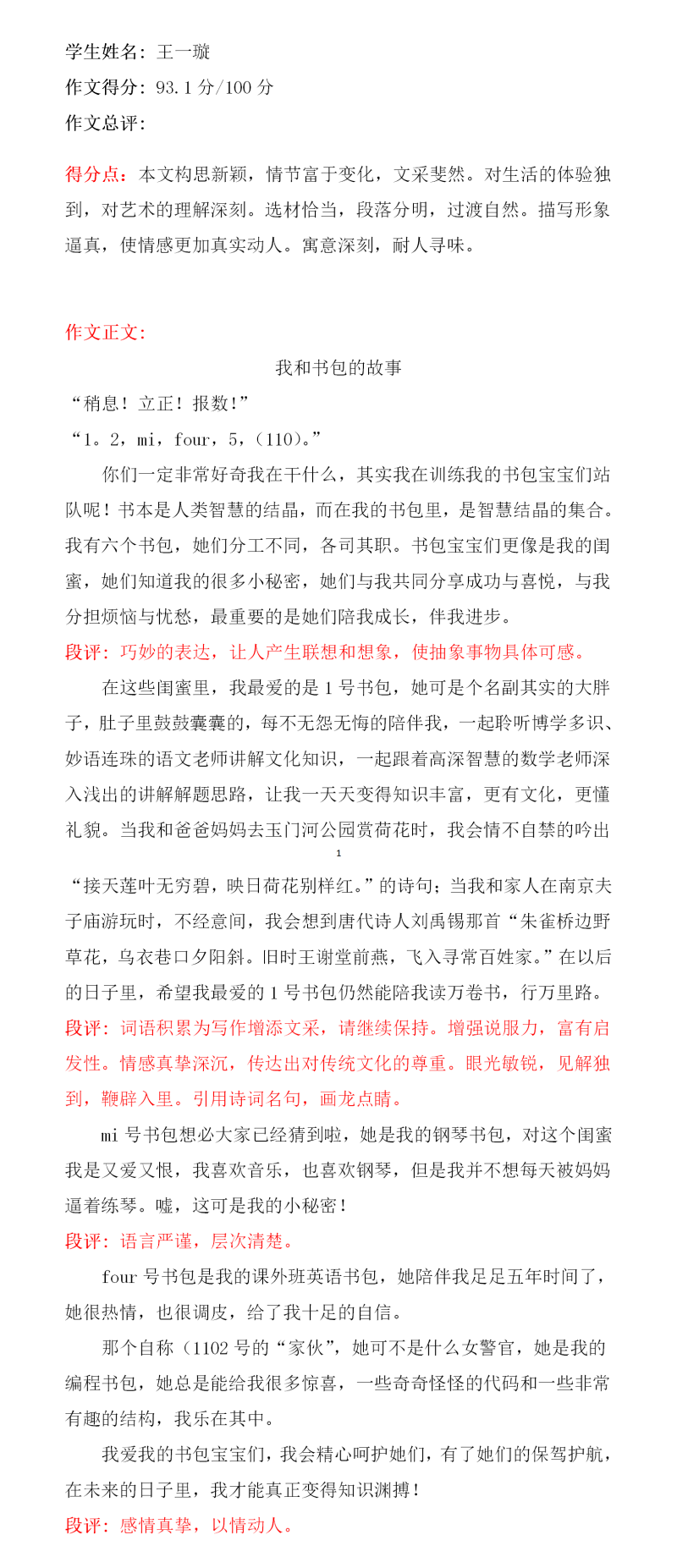 王一璇同学,你的作文构思大胆奇妙!多处采用拟人的修辞手法,把你和书包的故事,写成你和书包们的故事,用生动活泼、幽默风趣的语言,讲述了自己和书包们的故事!字里行间处处可见,你对书包们的喜爱之情,也处处渗透着扎实的文化功底。文章构思巧妙,叙述完整生动,用孩子气的语言叙述,使文章充满了童真童趣,堪称优秀作文。宝贝,你为此类作文的写作开辟了新的思路,老师为你点赞!