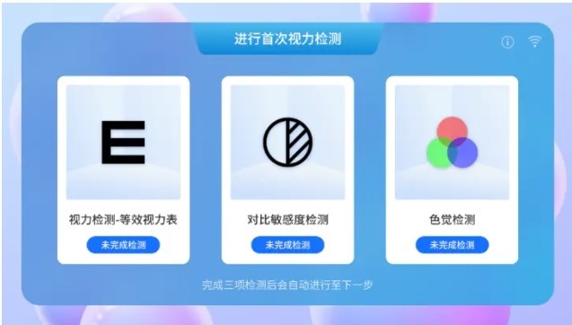 ④ 账号建立成功后,需执行视力评估、对比敏感度测试及色觉筛查,以确保孩子能够正常的使用远像光屏(排除严重弱视等不适宜使用远像光屏的情况)。每项检查均是先右眼后左眼进行,可以使用纸板等进行单眼的遮挡,检查时建议眼睛距离斜面玻璃中心点的观看距离为50cm。上述检查全部完成后,方可进入主页,正式启用设备。