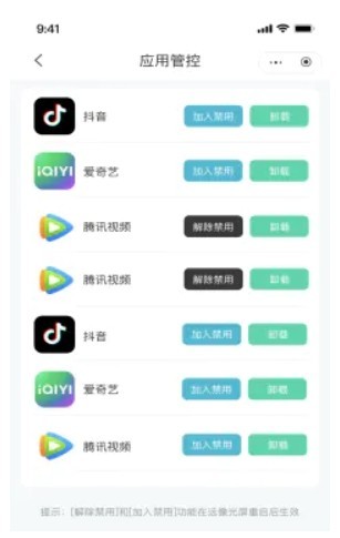 设备管控——应用黑名单:家长可从上千个系统App中挑选想要禁用的应用,加入禁用列表,重启设备即生效。若孩子尝试下载禁用列表中的App,系统会在App安装成功的瞬间立刻卸载,阻止使用。