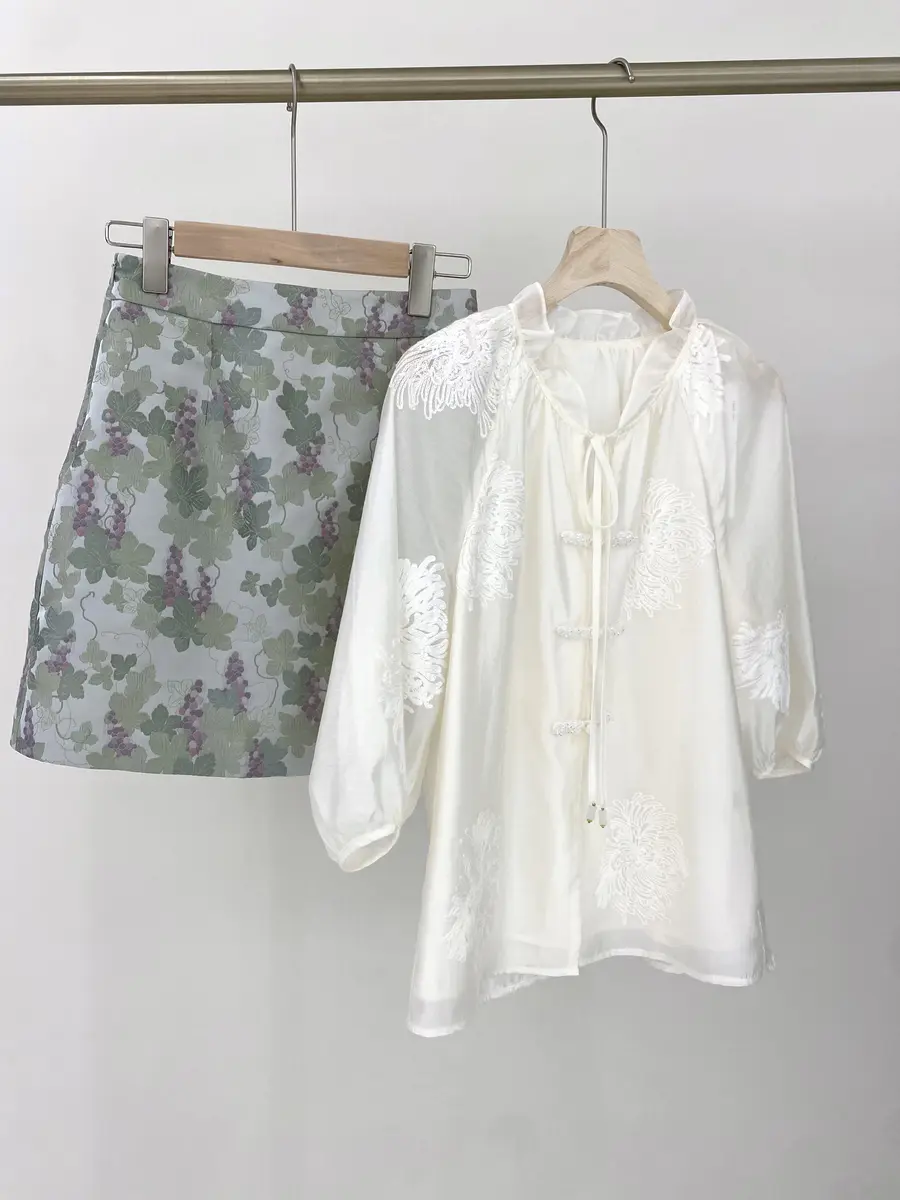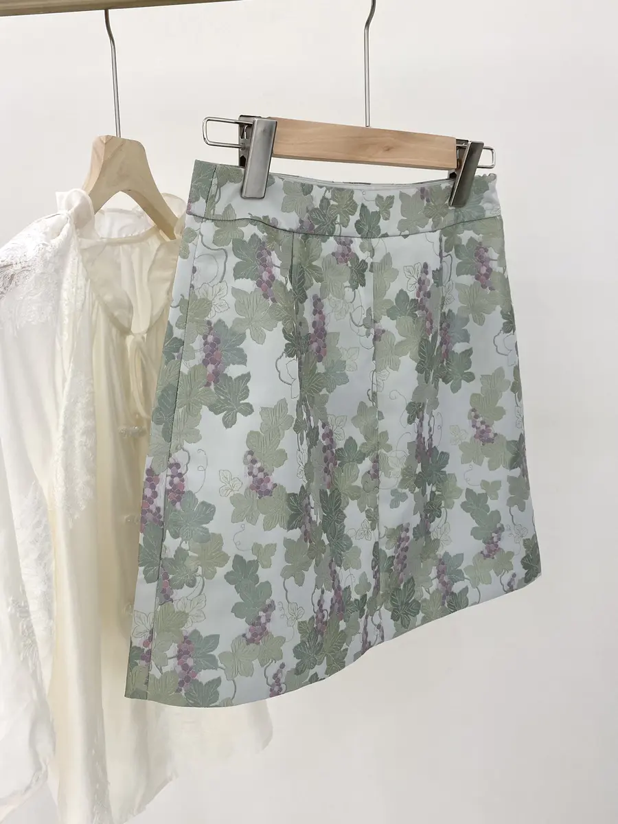 下半身推荐搭配韶光吹彻小半裙,葡萄藤蔓提花面料,颜色超级夏天,经典A字版型,好穿不调身材~搭配花卉小衫,仿佛误入夏日花园