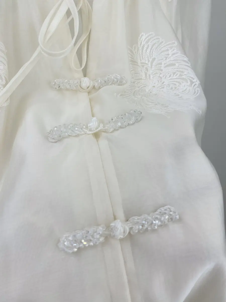 领口设计为木耳边小领,比一般的圆领会更加通勤精致,门襟点缀以新中式钉珠盘扣,在光线下会一闪一闪非常好看