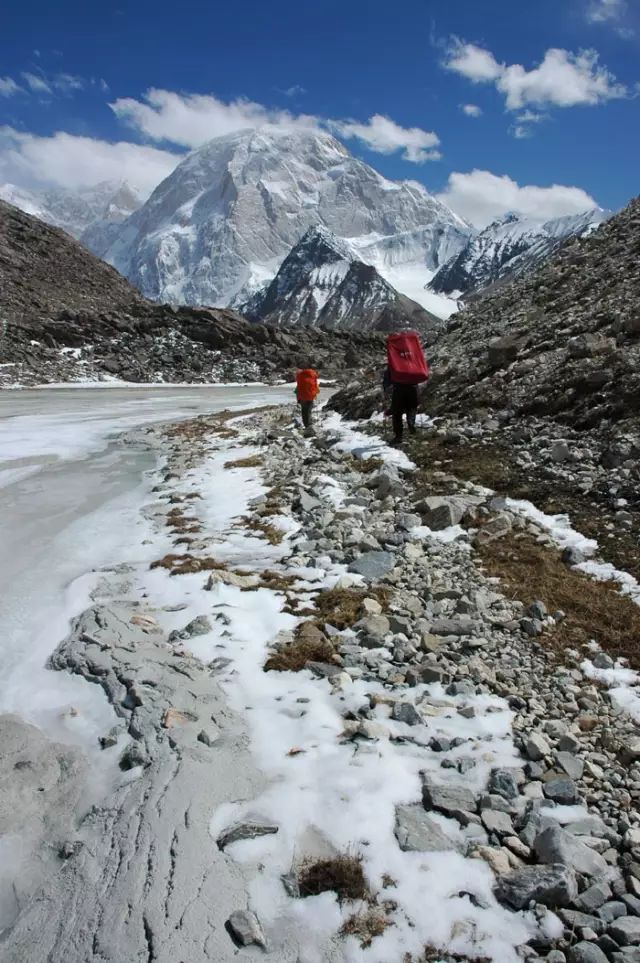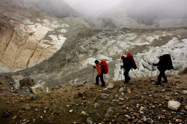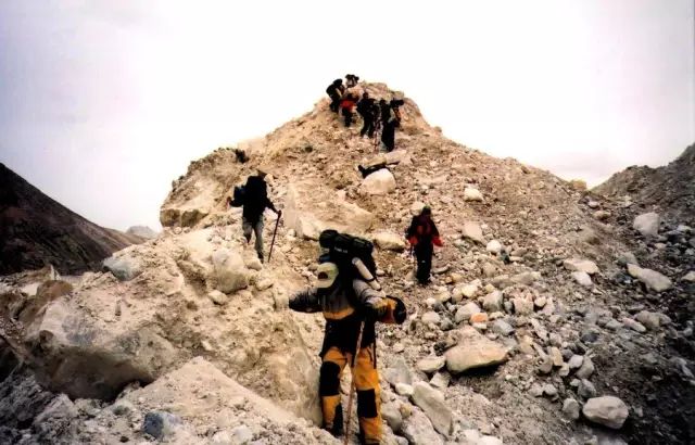 下午,浓厚的雾气从远处的山谷里开始向上蔓延,潜在的危险又在向我们逼近。所剩无几的食品也不允许队伍再有任何担搁,我告诉大家,我们没有时间了,在冰川上多耽搁一分钟便多一分危险,如果天黑前跨不过冰川,整个队伍就将陷入极度的危险之中,为了活命,我们只有拼了。为了节省队员的体力,我凭借自己的冰上经验走在最前面探路,在确定线路安全准确后才让全队通过。为此我体力已严重地透支,以至于在过最后一道冰河时他差点出了意外。杨华也因为一直尽力协助我来回运送队员及他们的背包,也造成体力透支,跳跃冰河时险些落水。