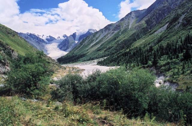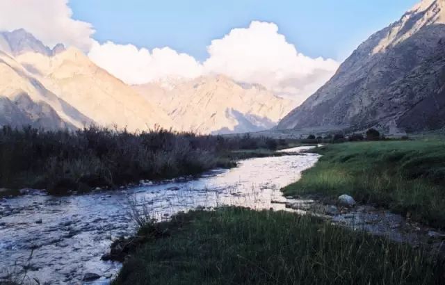夏特谷地是典型的天山北坡第四季冰川谷地之一,当时冰川分布最远可至海拔2000米左右的山口附近,在谷地中随处可见古冰川的痕迹。8月10日10时,当全体队员步入夏特谷地时,踏着绿茵似的草地,望着争奇斗艳的野花,这一切无不给人以生机勃勃之感。举目南望,近在咫尺冰峰雪岭,时而云雾迷漫,若隐若现,时而天高云淡,冰山毕现。我们无不为大自然的神奇而赞叹。下午3时,当远征队穿过风景宜人的夏特谷地时,在河道的转弯处果真发现了一座木桥。当立于桥上,桥下的河水咆哮奔腾,令人毛骨耸然,彷佛随时都有被卷入激流之中之感 ——这只是阿不都大叔眼里的小河,木扎尔特河的水量又是什么样的呢?