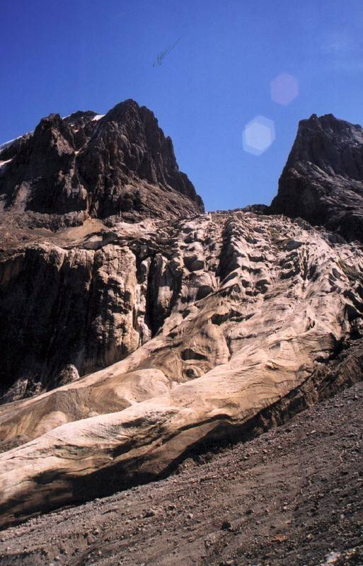 发源于雪莲峰下的巴什克里米斯冰川和来自5000米以上雪山的冰川,在达坂附近汇聚成了一条30多公里的长、2公里宽的木扎尔特冰川。由于数万年的冰川运动,冰谷两侧的山峰的脱落,在冰川上覆盖了一层石块,登高望去,冰川象是一条褐色的巨龙,从皑皑的雪山上倾泻而下。按照1:20万军用地图的标定,夏特古道沿西南方向斜切木扎尔特冰川,跨越冰川的距离有6公里,别看这短短的距离,它耗去探险队一天半的时间。