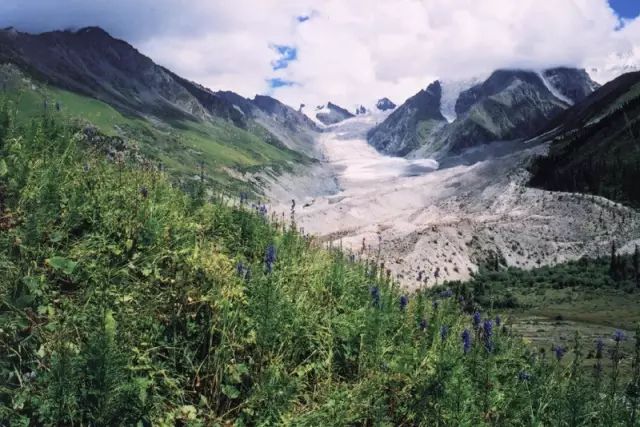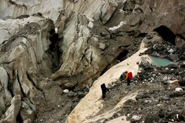 8月13日探险队离开了古堡,向冰川走去。由于冰川的退缩,冰川末端落差很大,短短300米的距离落差达500米。当队伍走到断崖附近,眼看着还有100米就可以下到冰川的底部,平坦开阔的河床近在咫尺,远处山坡上成片的白色石灰岩在阳光的照耀下,真象是一群群悠闲的羊群。走到前面的队员,一阵兴奋,惊呼“看到羊群了,下去吃羊肉……”。