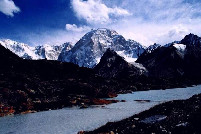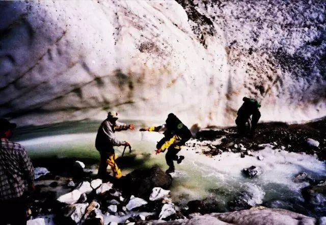 探险队向无名墓告别后,我带领大家沿昨天侦察好的线路踏上了冰川。木扎尔特冰是我们所见过的最可怕的冰川,冰块的挤压运动,在裂缝交错的冰川上隆起了小山似的冰塔,冰川的融化,在不足2公里宽的冰川上冲出了三条又宽又深的冰沟,沟底咆哮的冰河震耳欲聋。当队伍一绕过了几个大冰缝后,被第一条冰河挡住了去路,要想通过必须寻路下到沟底,这对没有穿冰爪的队员来说是非常困难的,如失手滑到冰河里,那将是致命的。走在前面的我过河时,脚下一滑,一屁股坐在冰水里,虽然队友陈祥书及时将我拉起,但我的照相机和背包还是进了水。