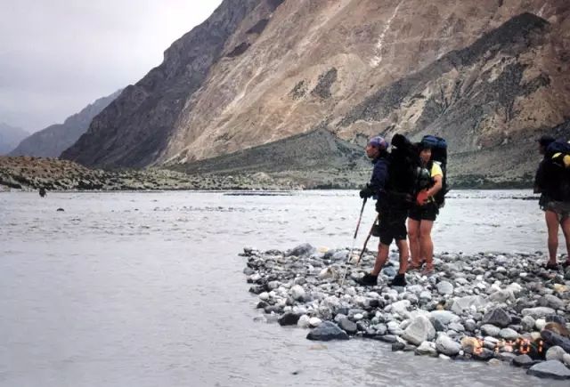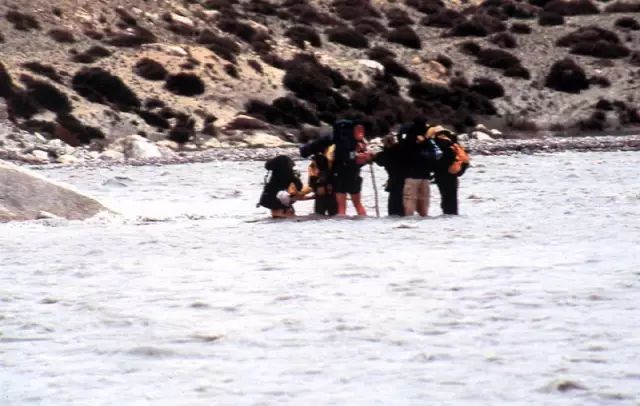 8月14日一大早,探险队急匆匆地离开营地,想乘清晨冰川融化前渡过河,不料渡过前面小河后,行走不到一小时,被一条河流阻断了去路。这条河是从主河道分出的一条支流,支流的东侧是100多米高近90度的绝壁,河水沿着80多米长的绝壁下缓缓流过,在转弯处泛起白色的浪花。徐泳第一个到达水边,他凭着年轻人的勇气,开始爬上悬崖,想在绝壁上找到一条线路。董务新是第二个到达河边,不由分说挽起裤腿就向水中走去,边走边大声喊,让徐泳下来跟他涉水过河。老董出发时就穿着一双凉鞋,当大家换鞋的工夫,他已向西渡过了一条十来米宽的小河,登上了河道中央的沙滩,高声告诉大家,水不深,催大家抓紧时间过河。