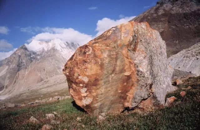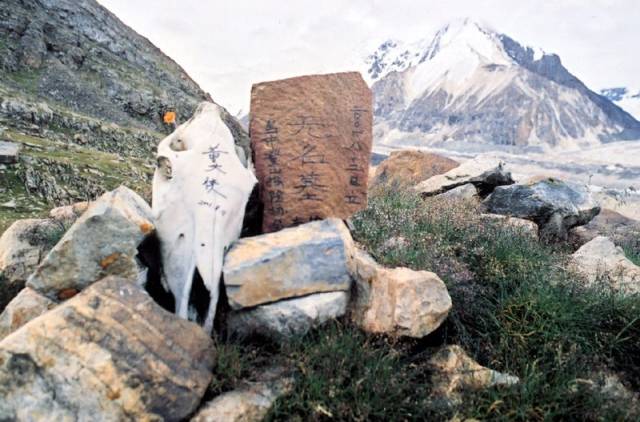 下午6时远征队跨过长五公里的木扎尔特达坂,到达哈达木孜达坂。这里,近看水草茂盛,向北远眺,陡峭的白玉峰拔地而起,发源于雪山之下的数十公里的木扎尔特冰川尽收眼底。达坂北侧有一个突起的小平台,上面有几块巨大的花岗岩,其中,在一块较平的花岗岩上人工堆积了许多石块,一看就知道是古人为纪念死者或拜神而垒的玛尼包。我、老董(董务新)和其他几个队员站在平台上,都为这里的风水之好而赞叹不止。老董有个习惯,每到山上见到玛尼包或纪念碑都要摆几块石头或献上一束野花。这次也不例外,他在玛尼包上加了好几块石头,还特意找了一块长石条在立在玛尼包上,在碑上用记号笔写上了“无名英雄之墓”,边文是“乌鲁木齐市登山探险协会,2001年8月”。