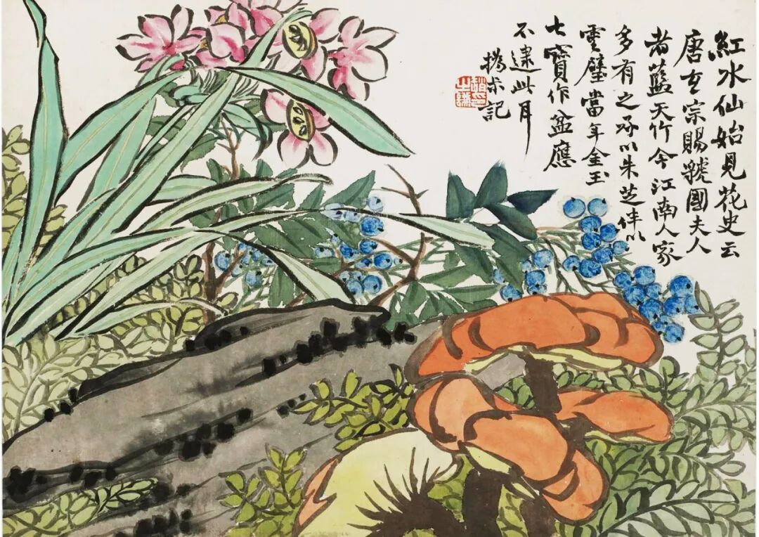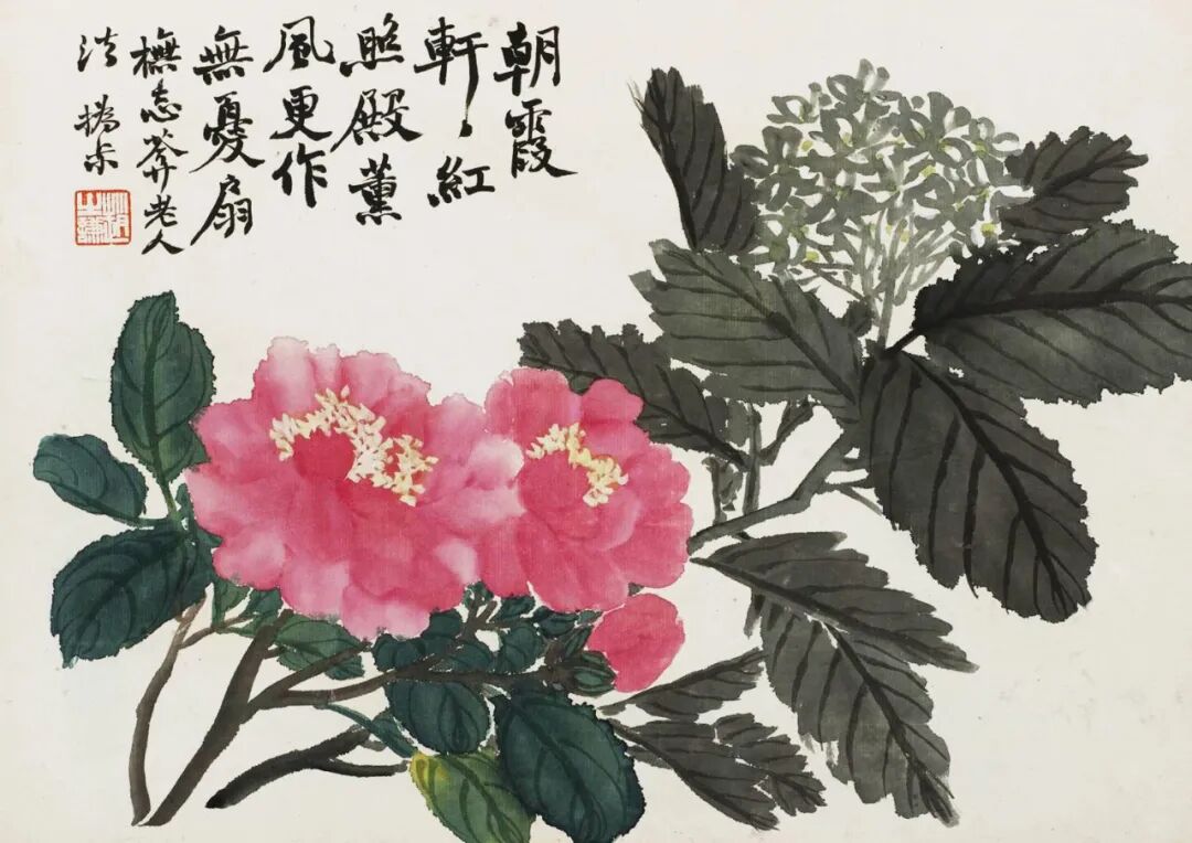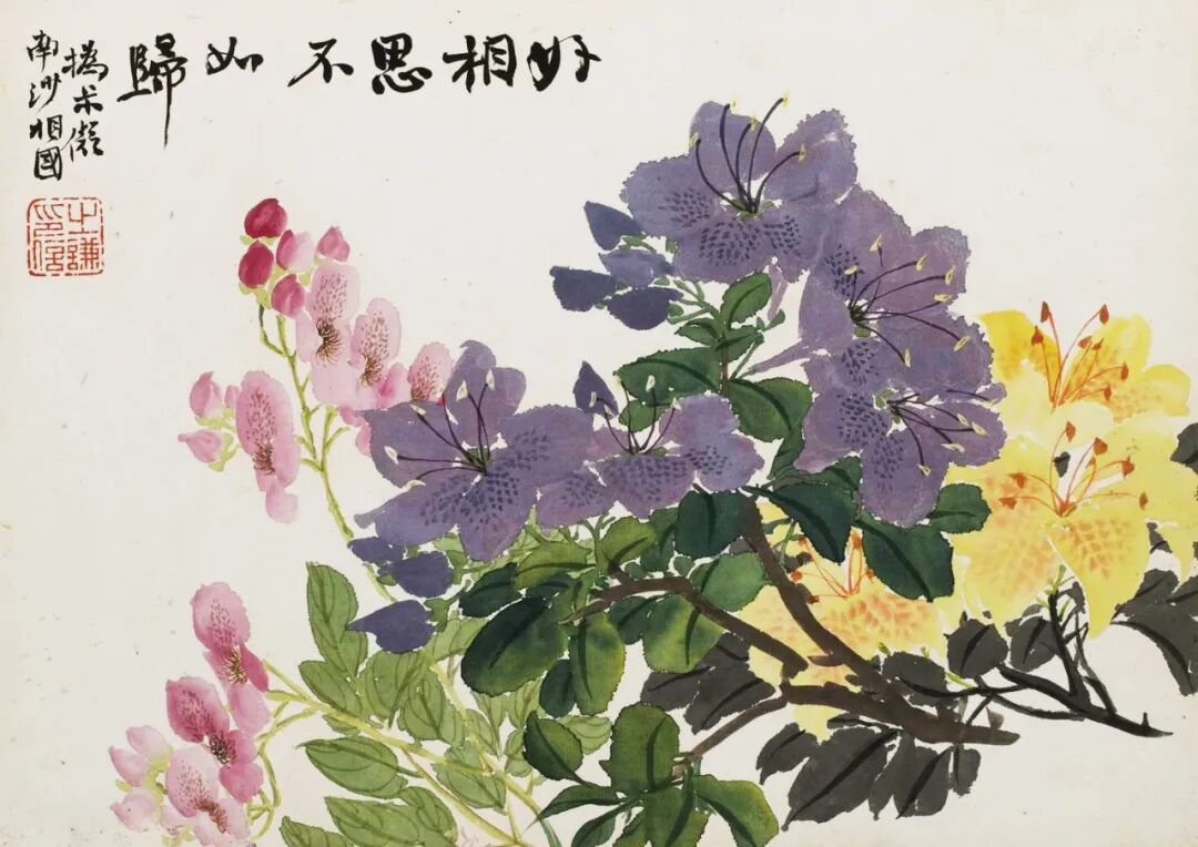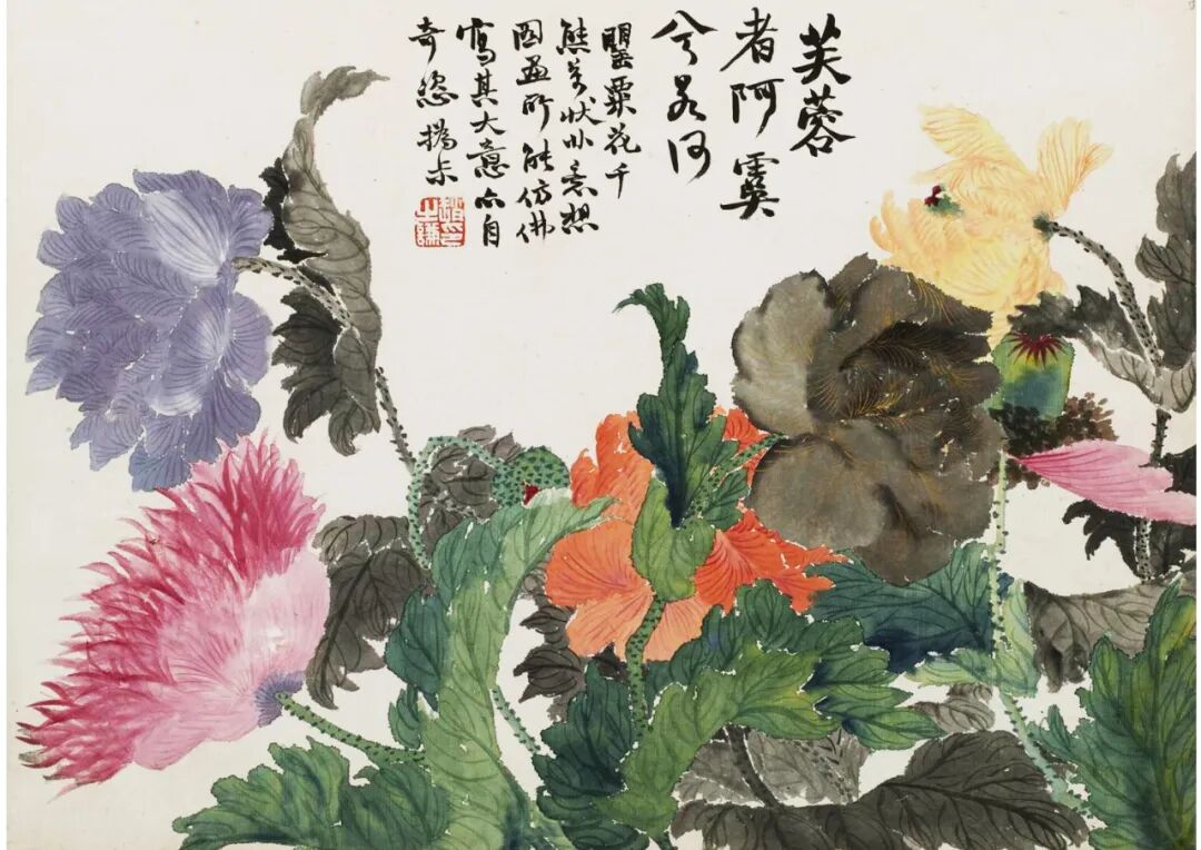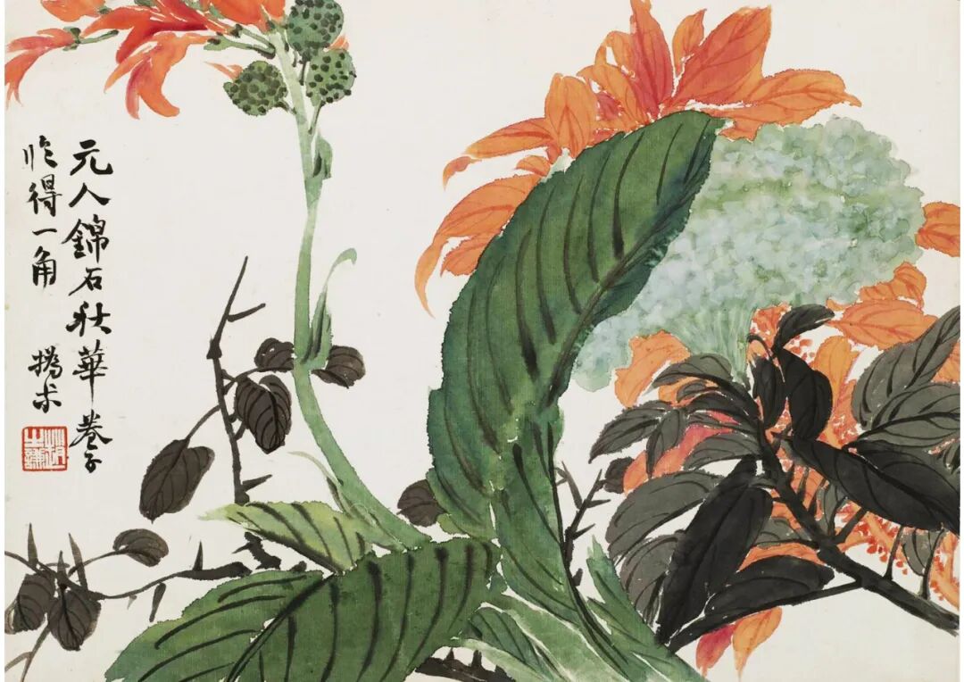 今天一起来欣赏他笔下这个花卉册页,设色极为鲜艳,多姿多彩,但并不艳俗,相反,因色彩对比强烈,越发显得精神饱满,生机勃勃。