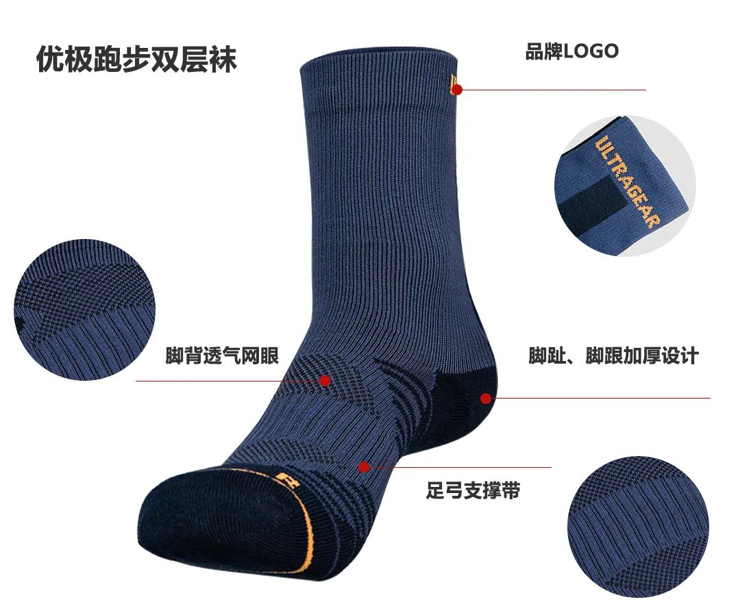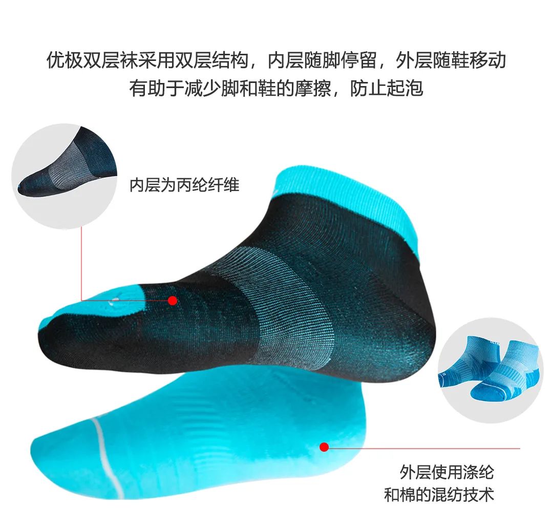 优极跑步双层袜采用双层结构,内层随脚停留,外层随鞋移动,有助于减少脚和鞋的摩擦,防止起泡。