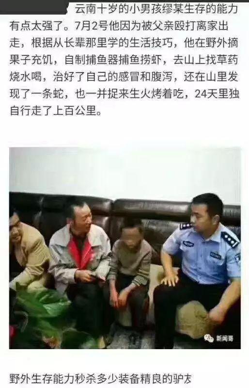 例如2017年7月,被父亲殴打的 云南十岁男孩小缪,离家出走24天徒步行走上百公里,自己抓蛇充饥、自制捕鱼器、采草药治病。