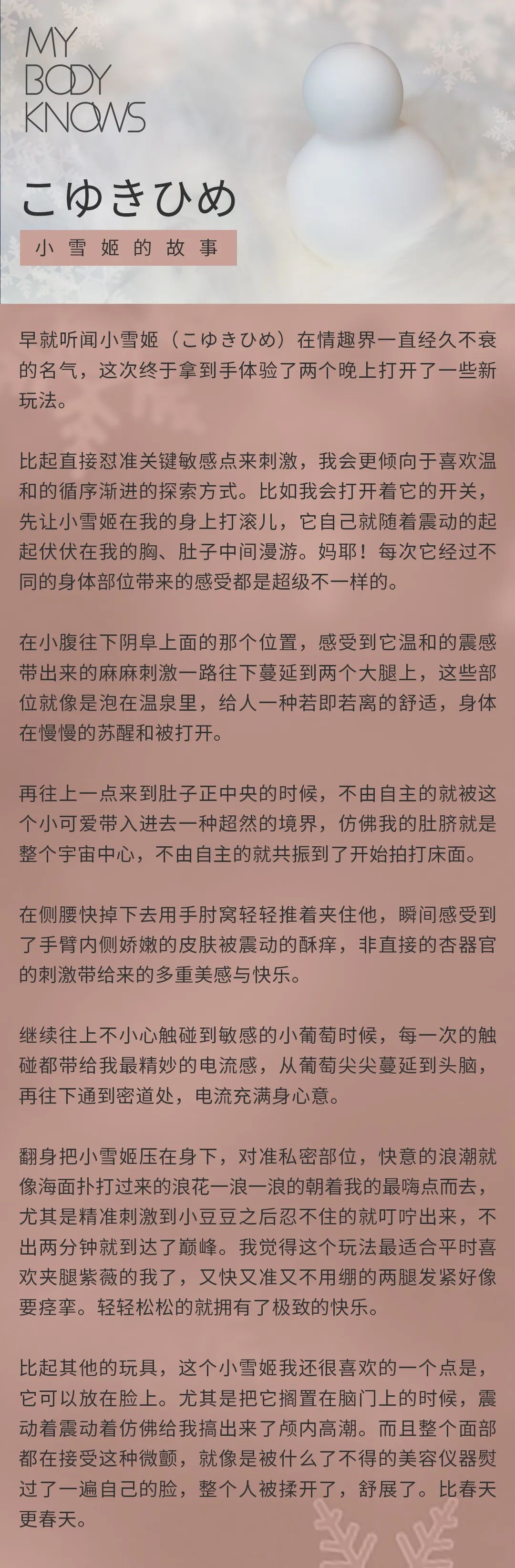如果你是一位很少探索自己的身体或愉悦体验较少的女生,你一直对进入或玩具有“排斥感”,这个没有任何侵略性的可爱的小雪姬完全消除你的顾虑,让它的温柔启蒙你的X的初体验。