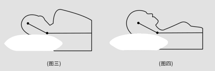 ▲枕头太高(如图三、四),会挤压喉咙,导致睡眠时呼吸不顺畅.长期使用高枕会使颈椎过于前曲,颈部软组织过度紧张、疲劳,且易发生落枕.