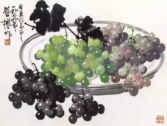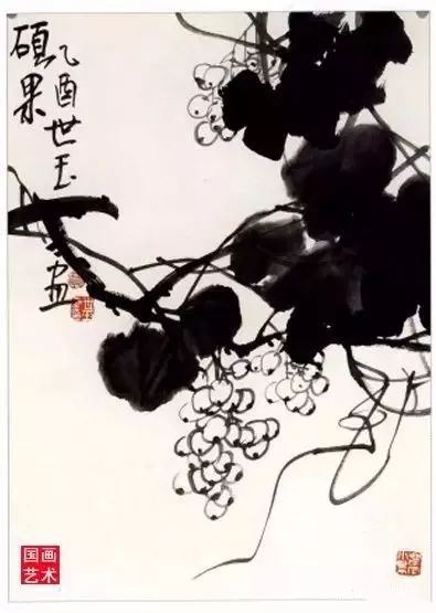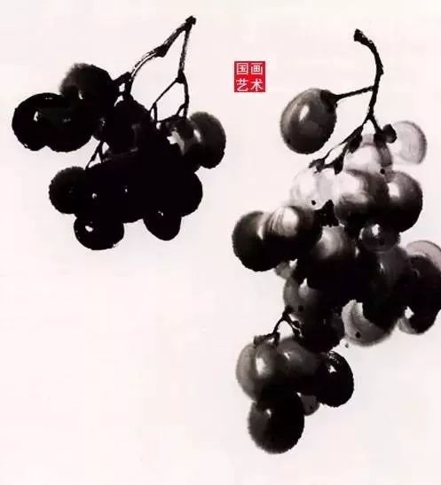3.葡萄叶子的画法:画叶子时,组与组之间笔墨要有浓淡、大小之分,外形自然,构成布局合理,与枝干、藤蔓结合有致。