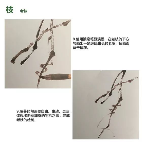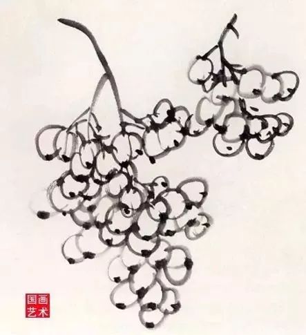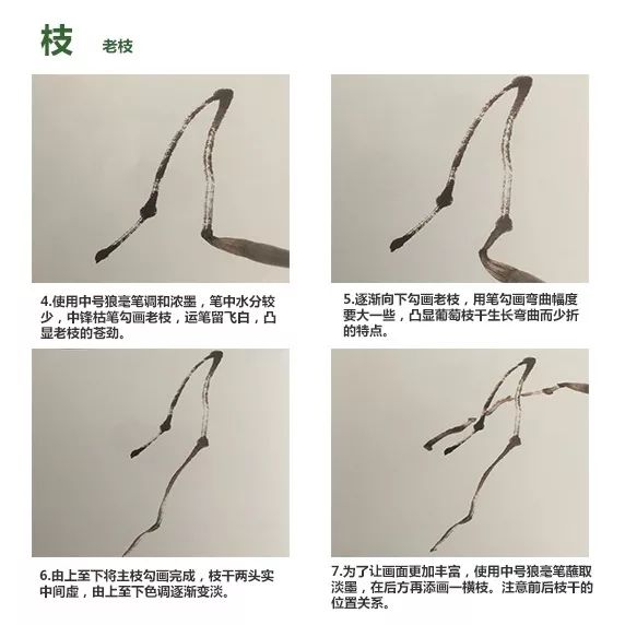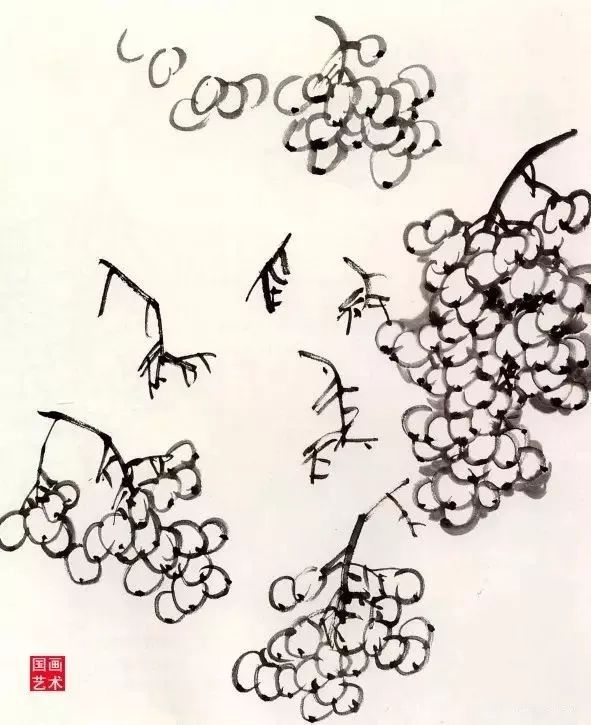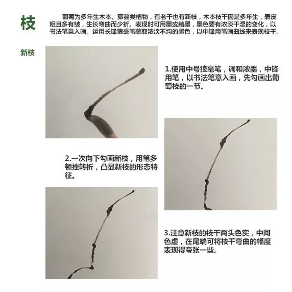 2.葡萄藤蔓的画法:葡萄藤蔓有新老主次之分,老藤应枯硬有节,较多顿挫,线条以中侧锋为主,行笔应慢,其形态要有转向变化,新藤蔓细,用笔需利索自然。