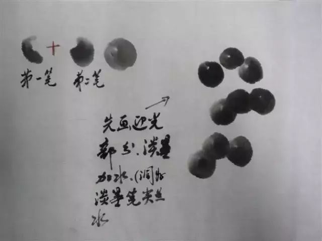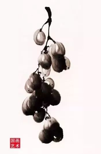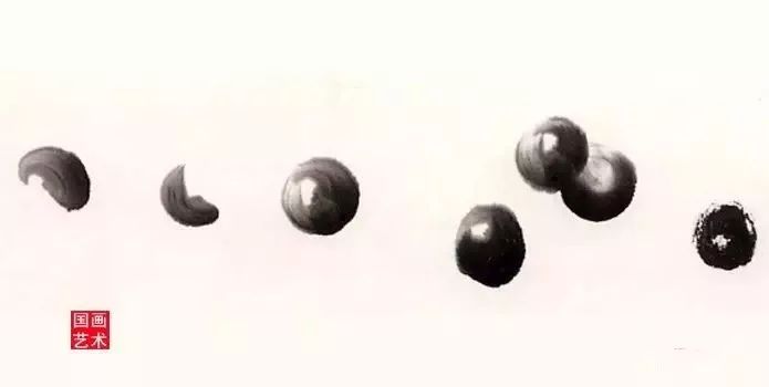 1.取小号的白云笔,调淡墨,笔根要浓些,两笔完成一粒(要留出高光,画葡萄才能晶莹透明)。