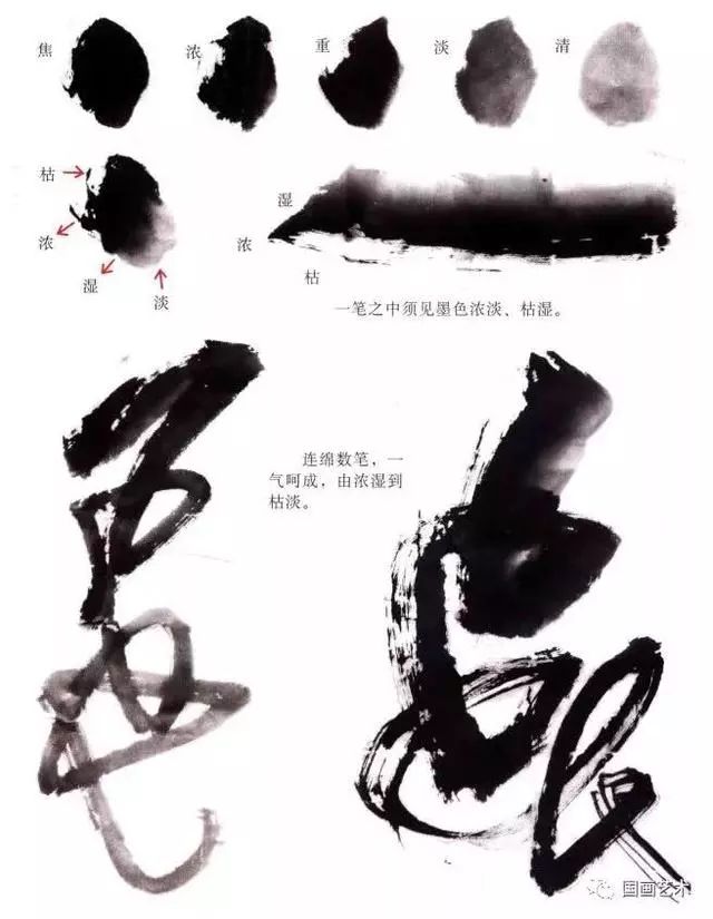 墨即是色,可分焦、浓、重、淡、清。在焦墨中分次加清水,加清水越多,墨色越淡。