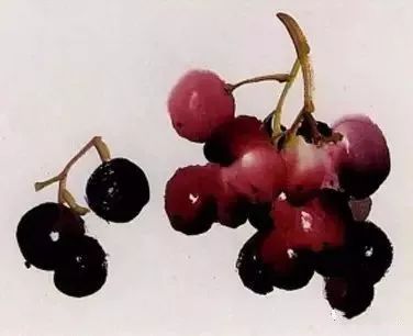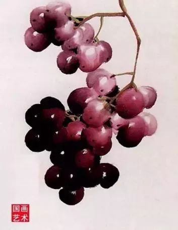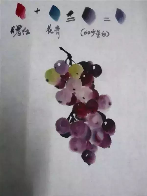 紫色是用红色和蓝色调配成的,曙红、胭脂与花青、酞青蓝可以调成不同的紫色。由于画面的需要,所画葡萄的紫色要有所差别。
