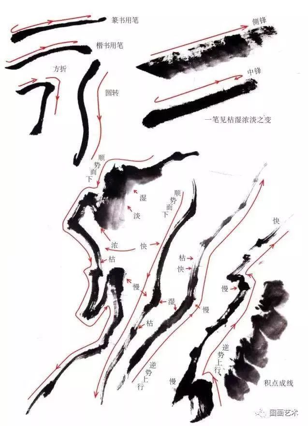 湿笔取韵,枯笔取气,枯中不能无韵,湿中不能无气,落笔尤若写字,气韵相连,笔脉相通。
