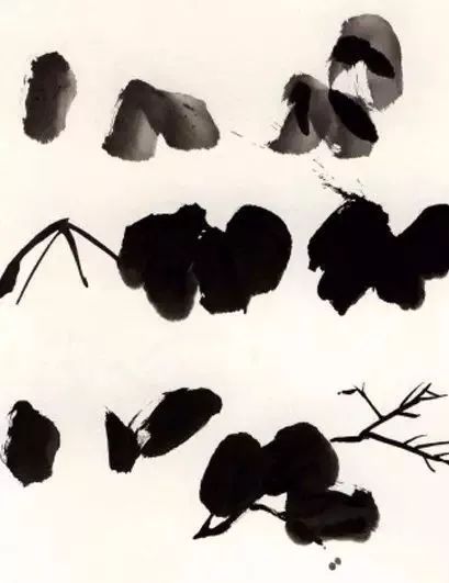 1.葡萄叶面为掌形四裂状,常用三笔组成一片叶面的画法,中间阔而长,两侧较短,画侧转面边缘上的翘叶可另调墨色,顺势推笔而成,要灵活随意、迅速。