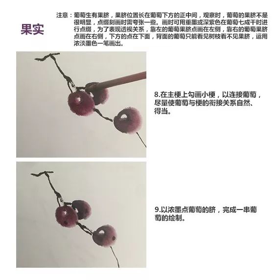 4.葡萄生有果脐,果脐位置长在葡萄下方的正中,正好在葡萄小枝的对面,在写生观察时并不明显,画时要有所夸张。画果脐时,在淡墨勾成的葡萄七成干时点圆点,为了表现透视关系,一串葡萄中靠左侧的葡萄果脐点在左侧,靠右侧的葡萄果脐点在右侧,下方的葡萄果脐点在下面,背面的葡萄只见枝不见脐。