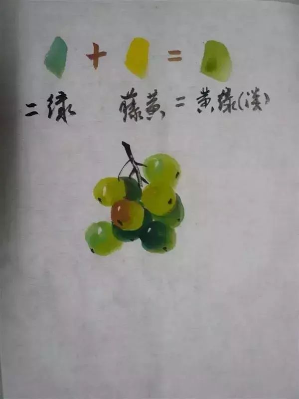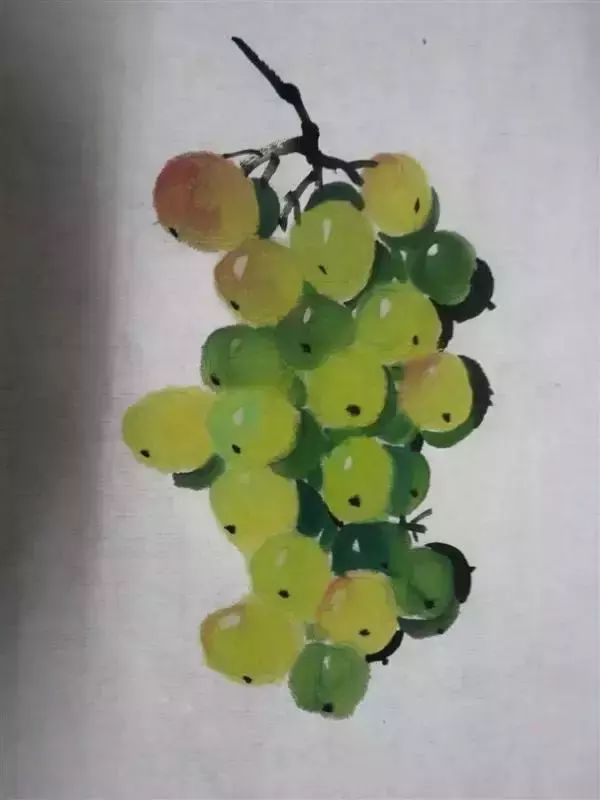3.完成一组较大串葡萄,要分组:一小组,一大组,小组色浅,大组色深。画柄时,取狼毫笔调绿色汁,笔尖蘸胭脂或赭石色,画时要有力度,主柄与次柄的长短、粗细要有区别。