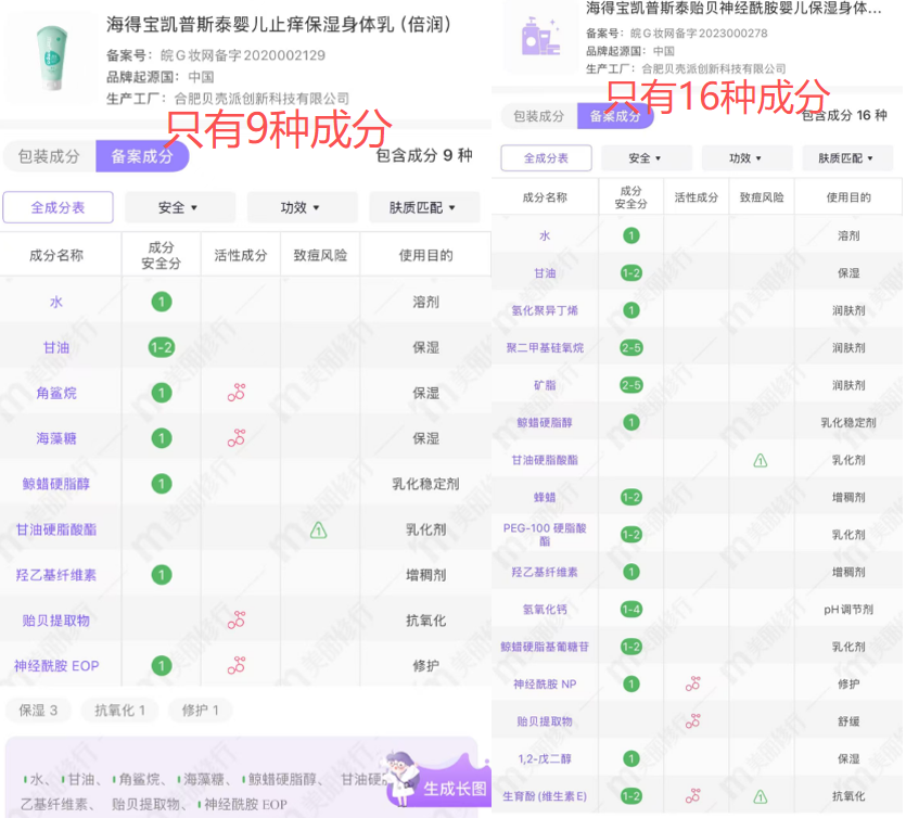倍润版,只有9种成分;清爽版,只有16种成分。