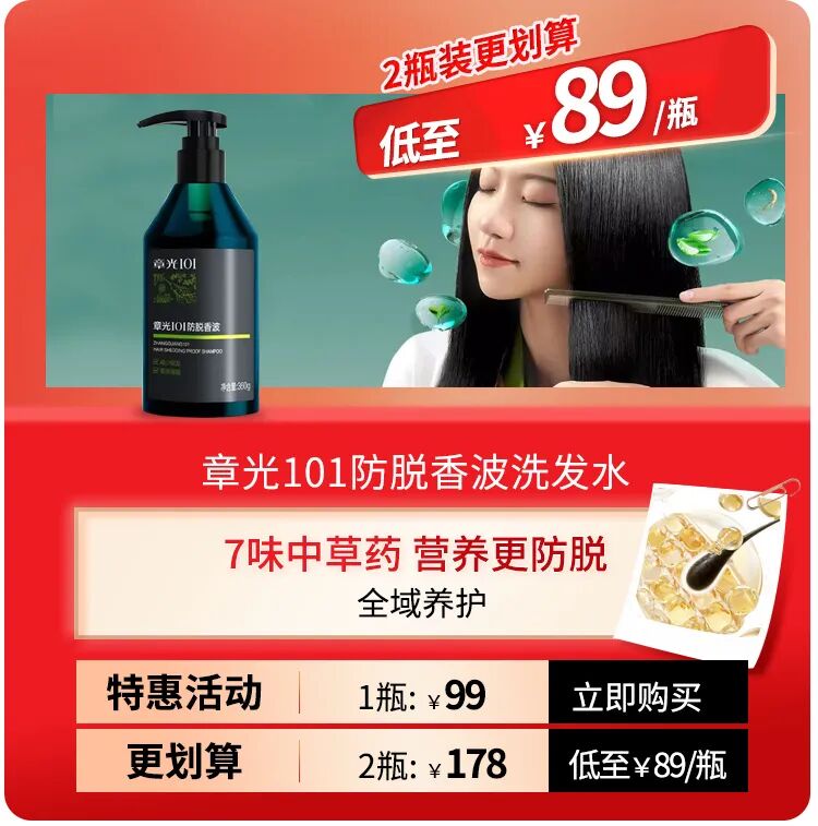 小编也把这款章光101防脱香波洗发水分享给大家,清洁头皮+调整头皮环境+营养头发,让头发扎稳根、长得壮、长得多!现在购买还有粉丝福利价:1瓶(360克)99元,2瓶(+赠8克*5袋旅行装)178元,每瓶仅需89元!