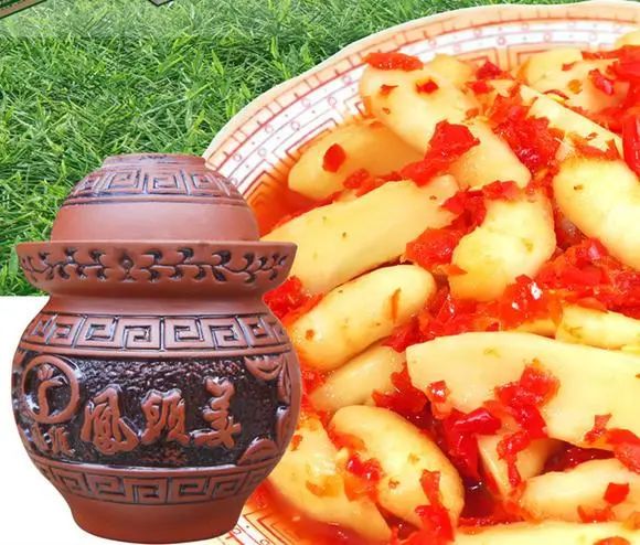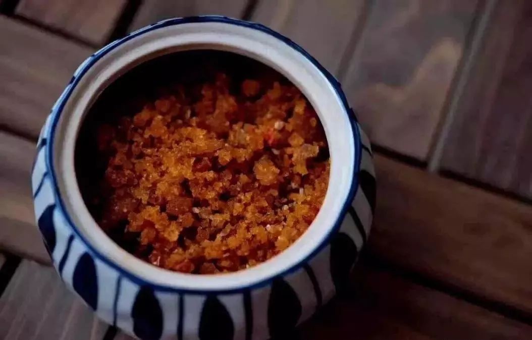 鮓广椒又称鮓辣椒,是土家族最爱的腌制调味品,把苞谷磨成粉,混入切碎的辣椒,加盐后放入坛中发酵。酸酸辣辣,非常开胃,一般哪里卖腊肉哪里就有鲊广椒。
