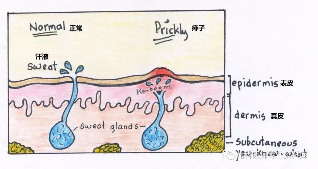 痱子是因为天气又湿又热,导致汗液不容易排出,滞留在汗腺,把汗腺顶端的皮肤角质层细胞泡肿了,从而把汗腺出口就堵住了。这样汗液更出不去了,只能向周围组织渗透,进入表皮和真皮,形成凸起的小水泡,严重的导致皮肤炎症。