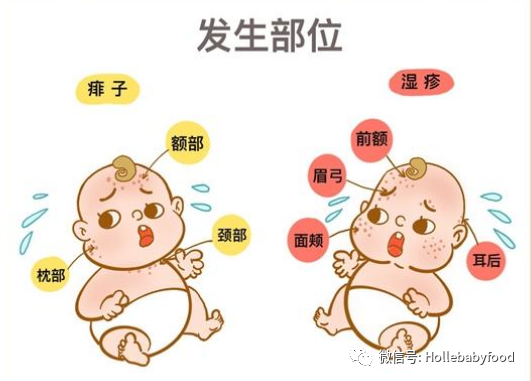 痱子最容易出现在闷热、容易出汗的地方,而湿疹容易出现在干燥摩擦的地方,也就是皮肤裸露处,从这点也能大体的区分下,大家可以看看下面的图片: