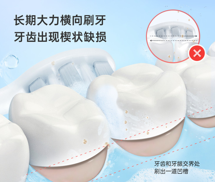 使劲刷牙并不会更干净,只会磨损牙釉质,在牙齿和牙龈交界处刷出一道凹槽(楔状缺损),严重的“拦腰折断”,整颗牙断掉。